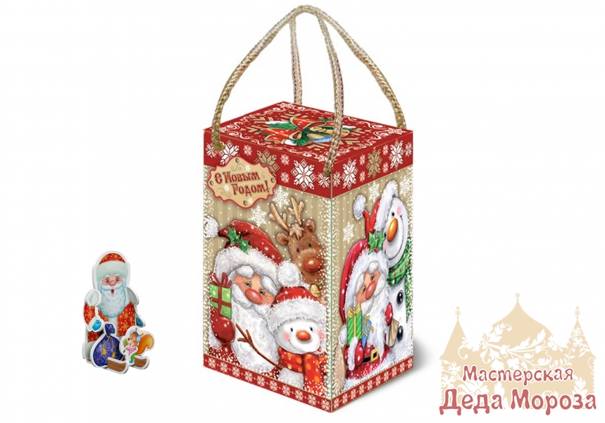 Яркая коробочка с изображением Деда Мороза в дружной компании снеговика и милых зверушек не оставит ни одного ребёнка равнодушным.
